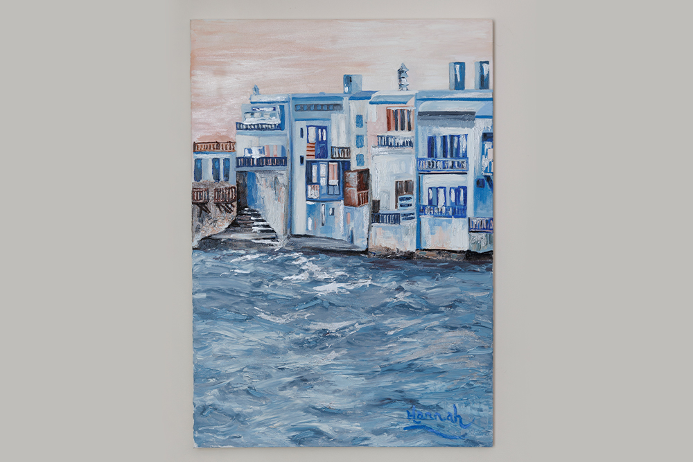 The emphasis in this painting for me was to create a bold depiction of the choppy rhythm of the movement of the sea as the central theme, which laps strongly against the shores of the buildings.